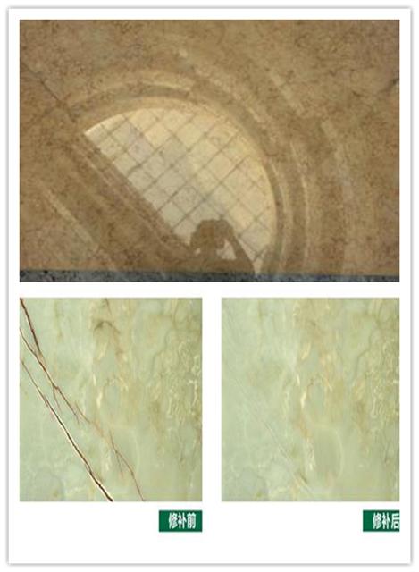 江西的盧總接到一個酒店地板保養(yǎng)翻新的工作,本以為是一件簡單的清潔打磨的工作,結(jié)果到現(xiàn)場一看,傻眼了!大理石的地面、臺階跟柱面,很多因?yàn)楸pB(yǎng)不好,出現(xiàn)了裂縫,有的甚至斷裂開,臺階也都出現(xiàn)裂縫與斷裂,怎么辦?弄不好一分沒賺還要賠,趕緊上網(wǎng)搜石材裂縫修補(bǔ)膠,找到了株洲世林膠業(yè)的SL3218透明裂縫修補(bǔ)膠。一看資料這款膠主要用于石材裂縫修補(bǔ),也可用于其它材料如金屬、木材、陶瓷及玻璃等粘接。本品為低粘度透明的雙組份膠粘劑,環(huán)氧樹脂為基體,改性胺為固化劑組成的。本品有以下特性:1.固化速度較快;2.和石材的附著力好;3.無色透明、光澤度較好、硬度高、適合淺色石板;4.粘度較低,滲透性好;5.操作方便; 6.耐磨、耐老化;7.有良好的耐候性、耐稀酸、耐稀堿、耐水;8.不含任何溶劑。9.無毒,環(huán)保。